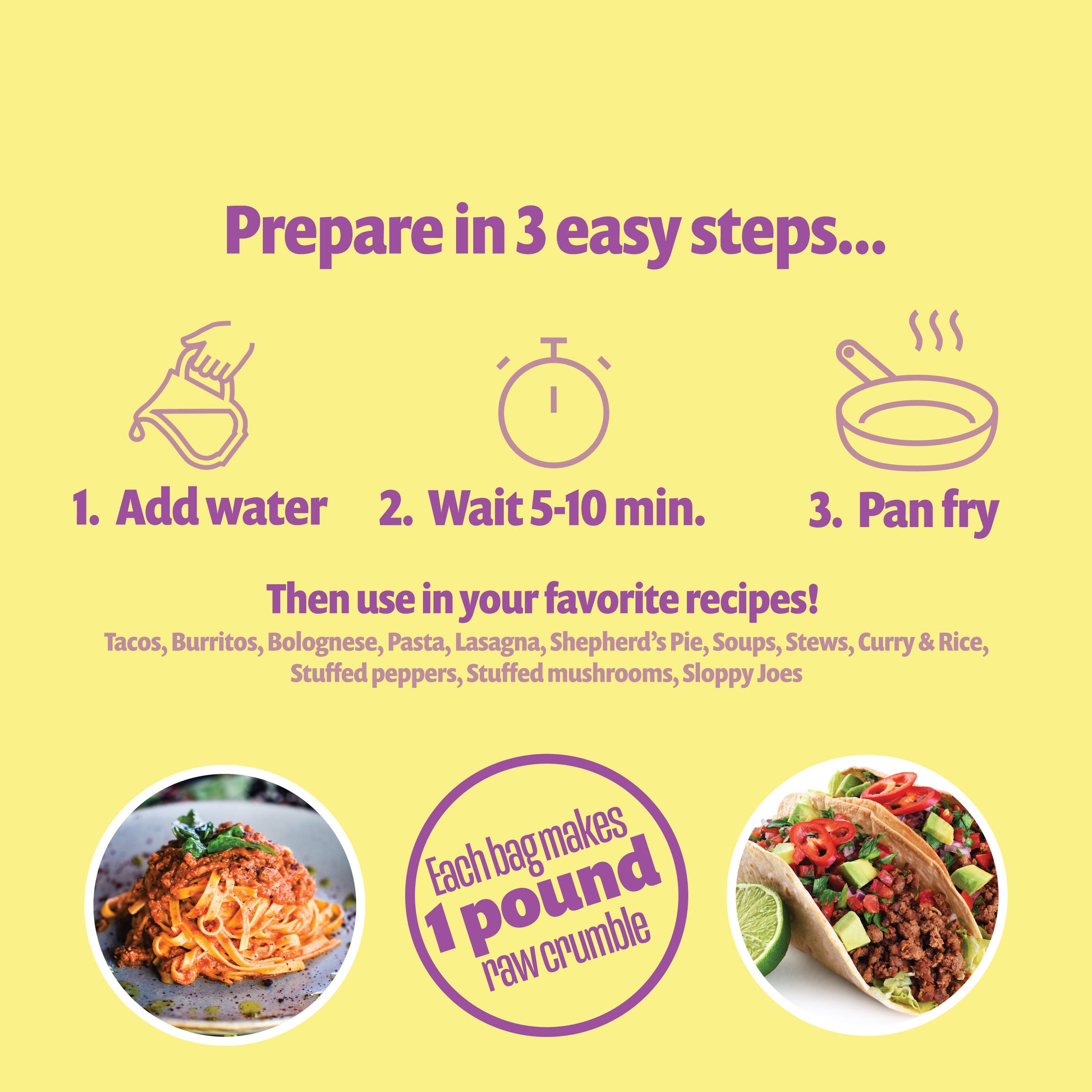 Shelf stable, just add water and soak to make 1 lb of raw ground.  Then fry to have a perfect crumble every time.